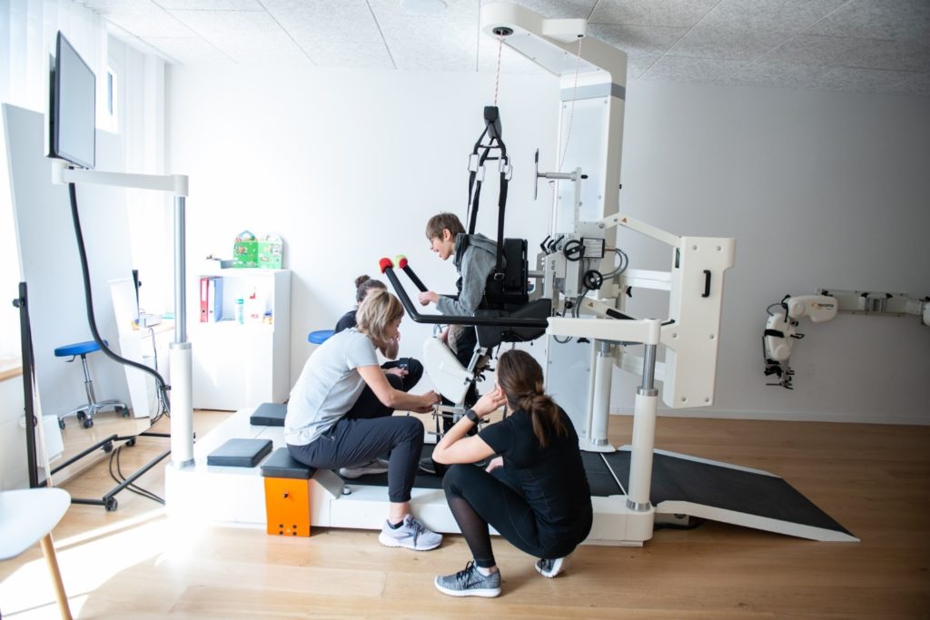 Le Lokomat® est un appareil médical de haute technicité conçu pour l’entraînement locomoteur fonctionnel intensif. La rééducation locomotrice est effectuée avec un allègement partiel du poids corporel et deux orthèses robotisées, commandées par ordinateur, qui guident les jambes du patient reproduisant le mouvement naturel de marche sur un tapis roulant. Le Lokomat® peut être adapté à un grand éventail de capacités locomotrices et pathologies grâce à la possibilité d’ajuster les pourcentages d’assistance au mouvement des orthèses et d’allègement du poids corporel, ainsi que les amplitudes des mouvements et la vitesse du tapis roulant.